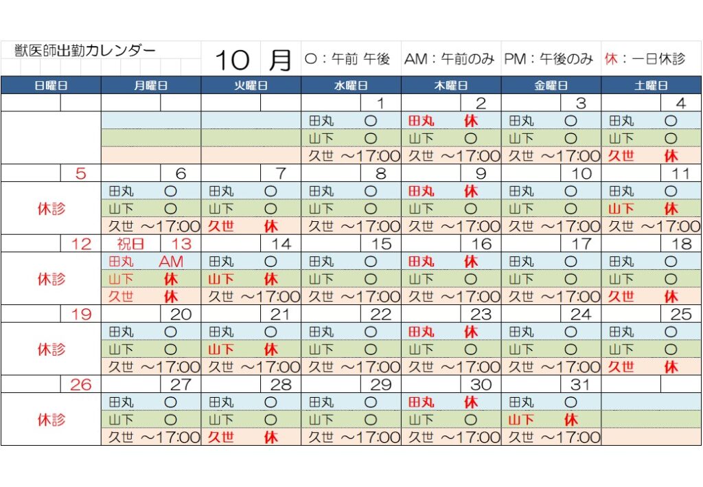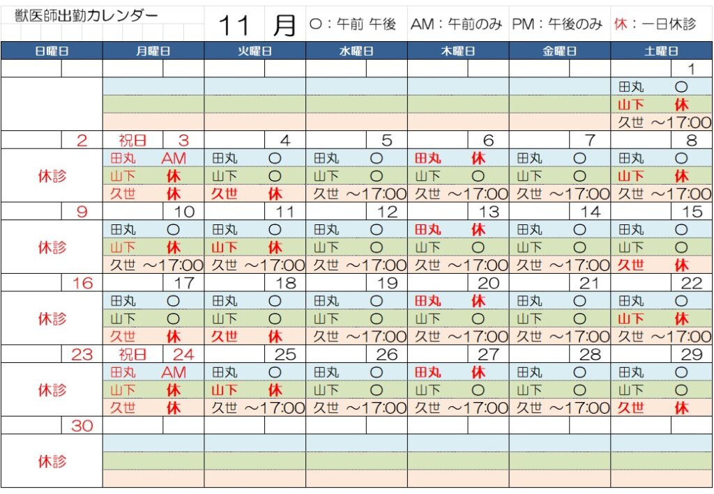 山下先生:隔週の火・土曜日、祝日 : 10月31日(金) 休診 、 11月10日(月) 休診